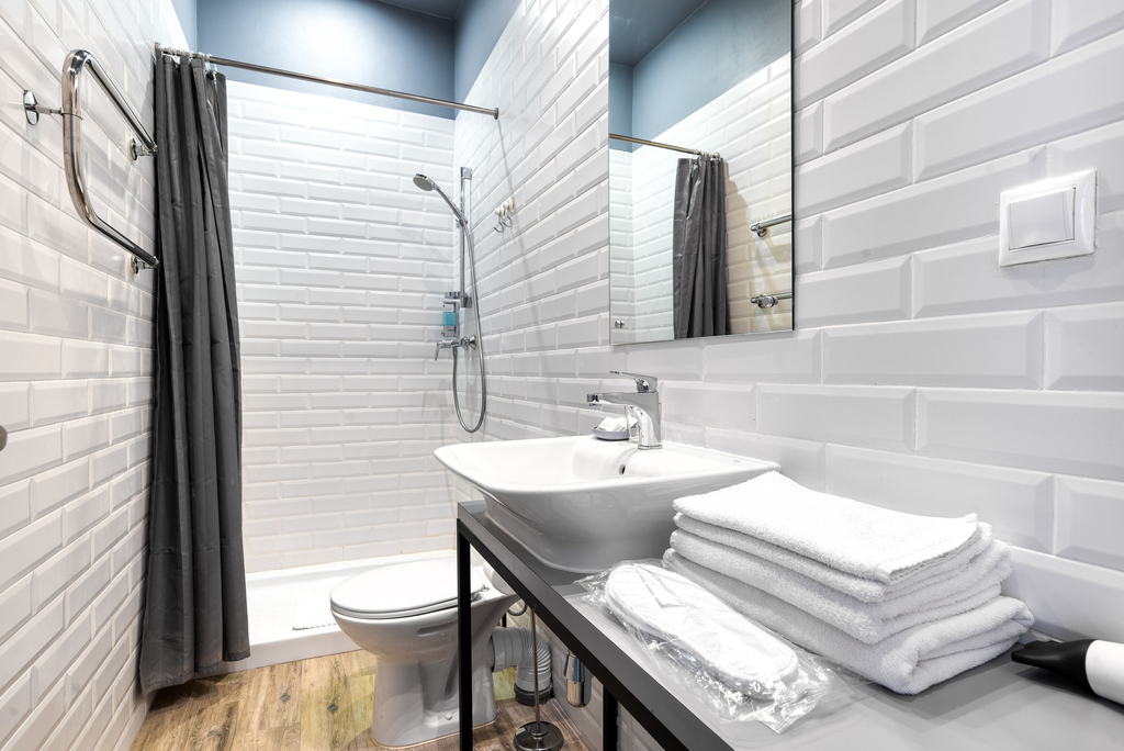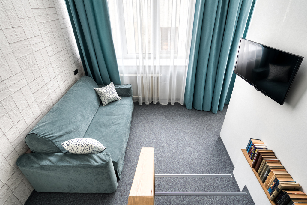 и дополнительном спальном местом в виде раскладного двуспального дивана, с мебелью в стиле лофт, практичная ванная комната с душевой, а также удобная рабочая зона.